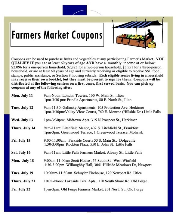The coupons can be used on locally grown (NY and adjacent states) fruits and vegetables. No jams, jellies, honey, baked goods, etc. Individuals should look for farmers that display a sign stating they accept farmer’s market coupons.