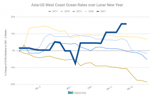 Still-surging US demand for Chinese imports saw Asia-US West Coast ocean rates climb more than 5% again this week, at a time when demand for ocean freight (and spot rates) normally level off and begin to decrease in the weeks after Chinese New Year (see chart below).