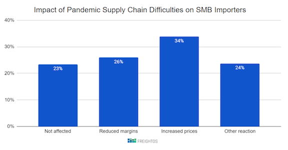 - A recent survey of SMBs importers using the Freightos.com marketplace found that 77% had been impacted by supply chain difficulties, and 34% had increased their prices as a result – an early indication that rising freight costs may end up being passed on to consumers.