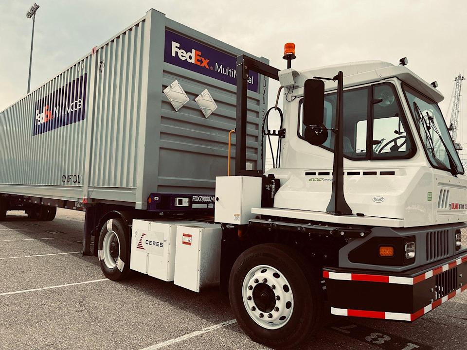 A FedEx container sits atop a Ceres all-electric UTR (cargo handling truck).