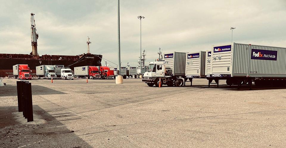 FedEx trucks move cargo from the vessel Genco Pyrenees.