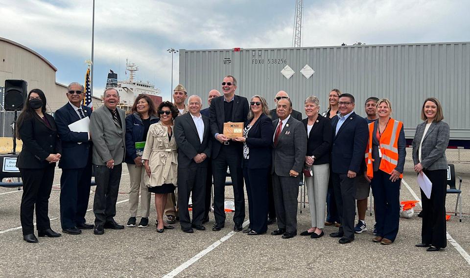 The FedEx team, Port officials including Oxnard Harbor District Commission President Mary Anne Rooney, Commissioners Jess J. Herrera and Celina L. Zacarias, CEO & Port Director Kristin Decas, Chief Commercial Officer Dona Lacayo, and Naval Base Ventura County’s Commander Captain Robert Kimnach welcomed the FedEx cargo containers in person with a plaque ceremony as they watched the first set of 53-foot containers get offloaded from the ship to the docks.