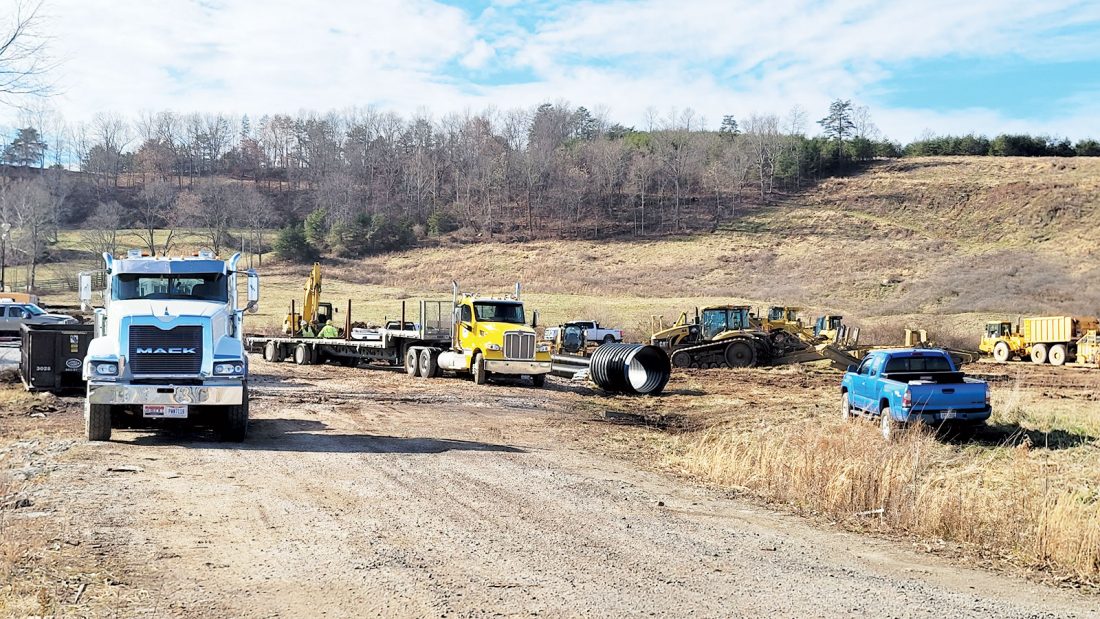 Trucks and heavy equipment are seen at property off Bosley Industrial Park Drive in south Parkersburg Thursday. Construction is expected to start Monday on a 250,000-square-foot distribution center to be leased by FedEx Ground. (Photo by Evan Bevins)
