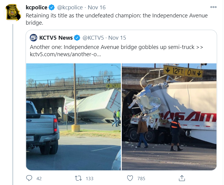 Third time is not the charm — For the third time in five days, the Independence Avenue bridge in Kansas City, Missouri, has caught another truck in its jaws. The bridge’s 12-foot clearance is notorious for devouring inexperienced drivers.