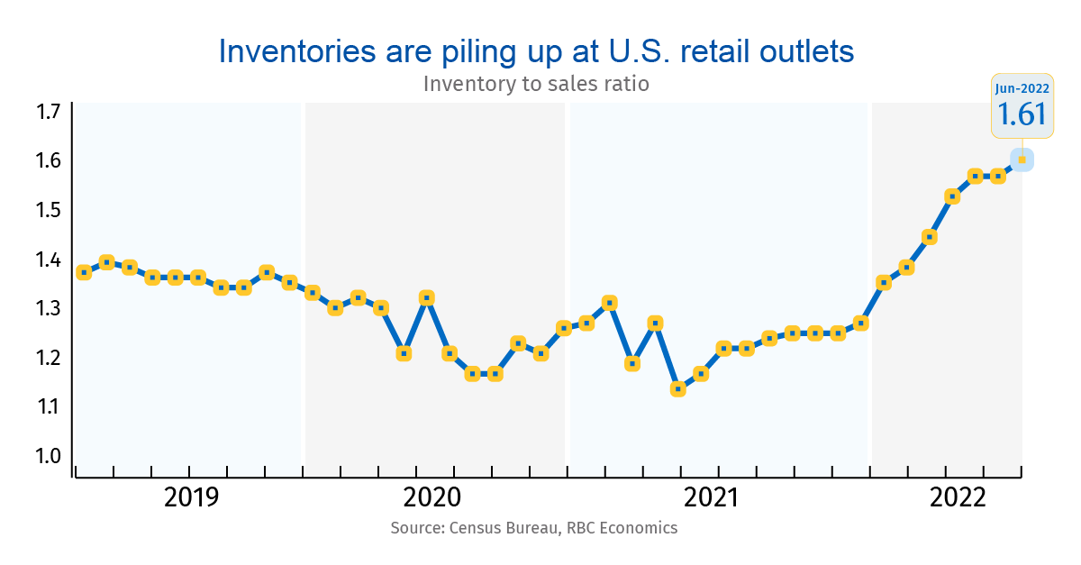 That trend is now reversing. Ports are no longer heaving with backlogs and cargo is moving more smoothly through the system. But spending is slowing just as those shiploads of electronics, clothing and other goods arrive. As a result, for some businesses, the struggle to meet demand has turned into an inventory glut. In June, the U.S. ratio of inventory-to-sales at general merchandise stores rose to its highest level since March 2006. That’s raising the prospect that, faced with bloated inventories, some retailers will need to cut prices.