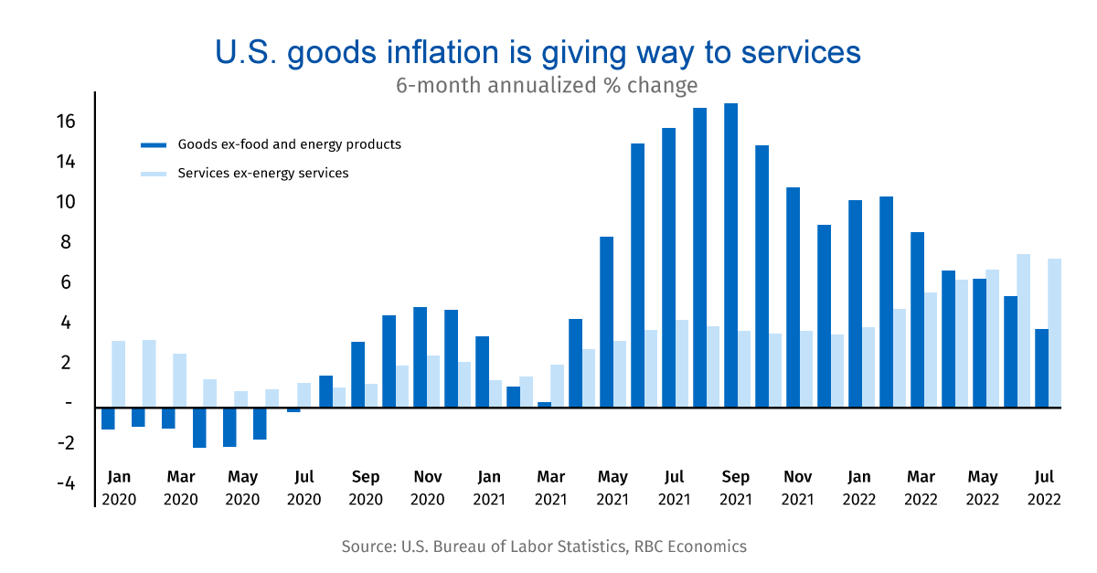 Despite evidence global inflation pressures may have finally peaked, it will take more than easing supply chain conditions to bring price growth fully back to target. Indeed, we expect headline inflation in Canada to end the year at a still-elevated 6.2%, buoyed by higher demand for travel and leisure services. Recent developments have been positive—year-over-year CPI growth edged lower for the first time in a year in July on lower gasoline prices. And we expect inflation to ease closer to central bank target rates by the end of 2023. But we don’t expect that to happen without higher interest rates and a further slowing in consumer demand.