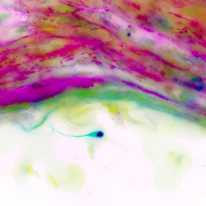 Nerves relay sensory or motor information in the body and are made up of nerve cells, or neurons,” says Gregoire. “In Professor Claudia Fallini’s lab, where I do my research, we study cellular pathologies in amyotrophic lateral sclerosis and frontotemporal dementia (ALS/FTD). We differentiate the neurons we study from induced pluripotent stem cells (iPSC), derived from patient skin or blood cells. Using immunofluorescence and our Leica DMi8 Widefield Fluorescence microscope, we visualized this stunning motor neuron. During the differentiation process, not all the stem cells differentiated into neurons, instead forming a mass of cells, visible here above the lone neuron.”