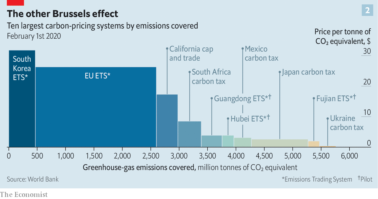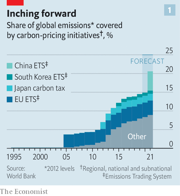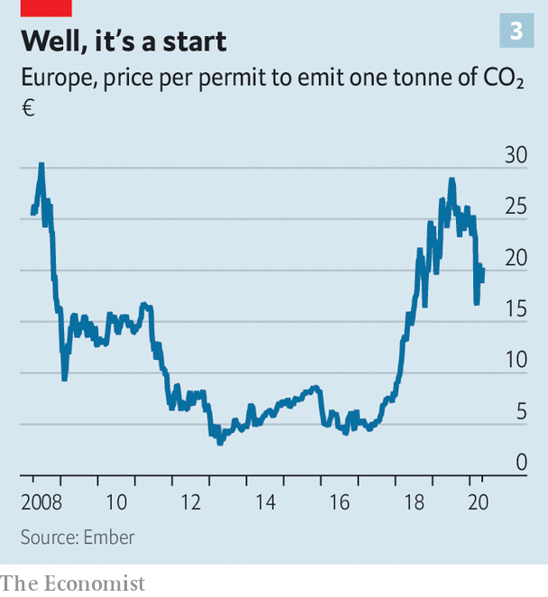 Despite such limited progress, advocates for a carbon price remain committed to the cause. Before the advent of covid-19, they also seemed to be on something of a roll. Since January carbon emissions have been priced at a minimum of C$20 ($14) per tonne across Canada. By 2022 that will rise to C$50. In 2021 70% of global aviation emissions were scheduled to enter a UN emissions-trading programme which aims to cap them at 2020 levels. China was going to launch a nationwide carbon market for its notoriously dirty power sector at the end of the year. And as part of its “green deal”, the European Commission had announced plans for the expansion of its Emissions Trading Scheme (ETS), already the largest carbon-pricing system in the world (see chart 2). Its carbon price, stuck in the single digits in the 2010s, rose to around €25 ($27).
