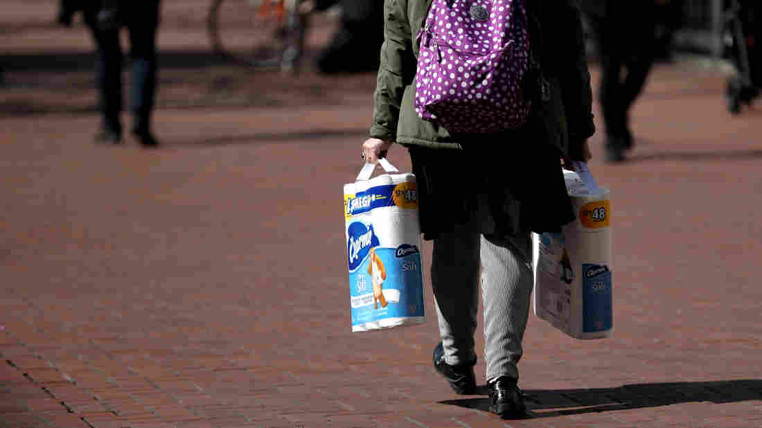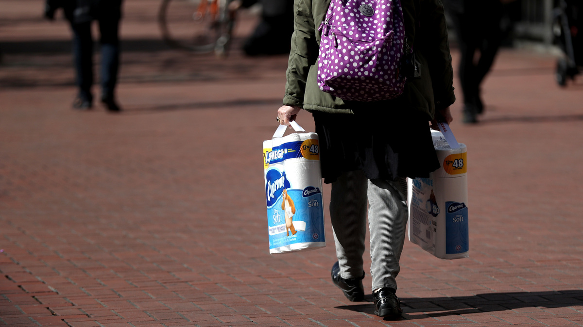 A pedestrian carries two packages of toilet paper as she walks along Market Street in San Francisco earlier this month.
