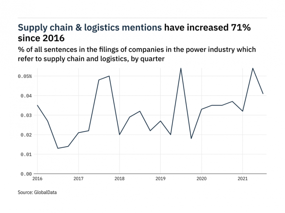 When companies in the power industry publish annual and quarterly reports, ESG reports and other filings, GlobalData analyses the text and identifies individual sentences that relate to disruptive forces facing companies in the coming years. Supply chain and logistics is one of these topics – companies that excel and invest in these areas are thought to be better prepared for the future business landscape and better equipped to survive unforeseen challenges.