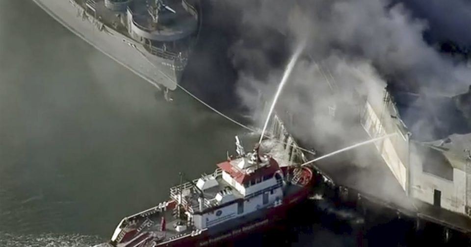 More than 130 firefighters fought the flames, with some using ladder trucks to drench the warehouse from above. A fire boat was used to protect the SS Jeremiah O’Brien, a liberty ship that stormed Normandy on D-Day in 1944.
