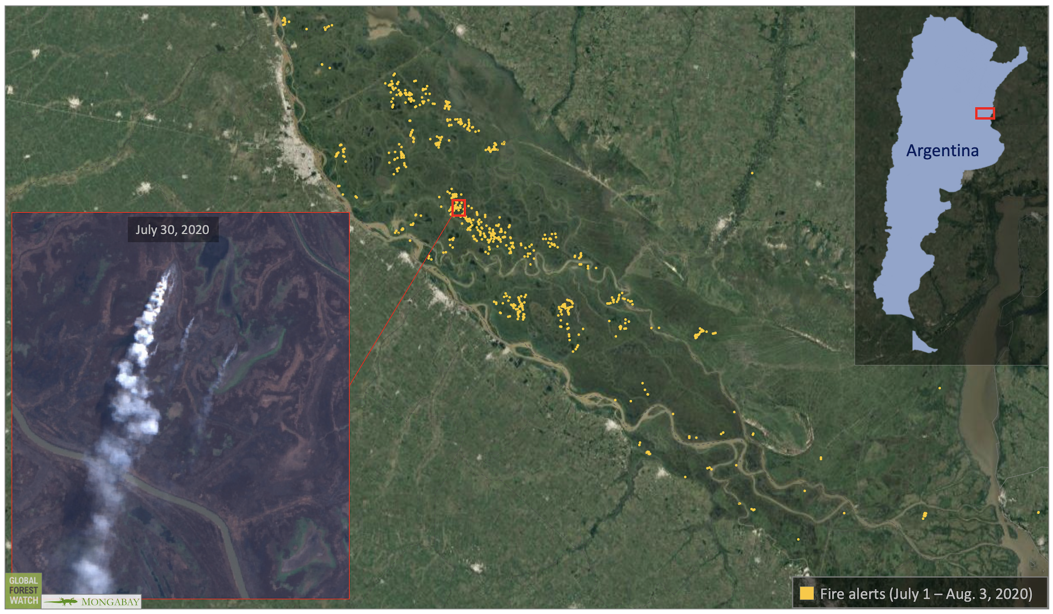 - Hundreds of fires are currently burning through the Paraná Delta region, an important wetland ecosystem that hosts a range of wildlife in Argentina, raising concerns among conservationists.