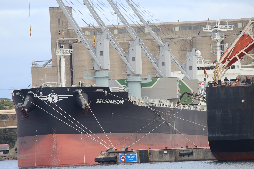 Canola pours into one of the hatches on the Belguardian moored at Portland in Victoria, and now on its way to California. Photo: Terry Sim