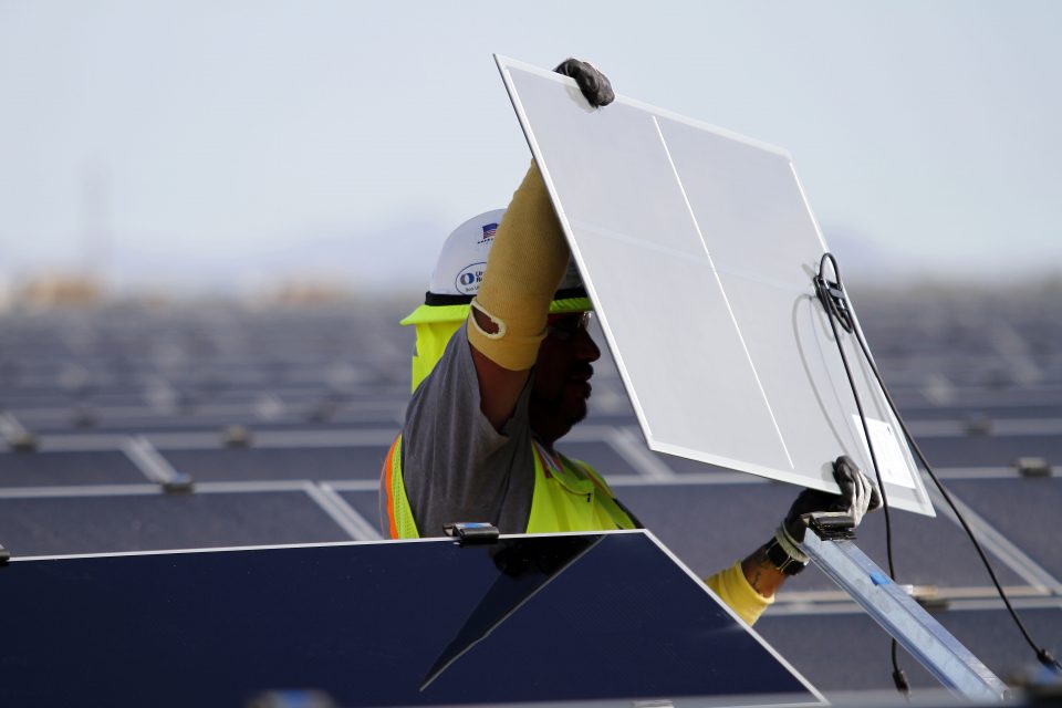 A worker installs First Solar Inc. photovoltaic solar panels at the Agua Caliente Solar Project in Yuma County, Arizona.