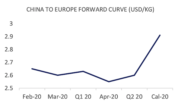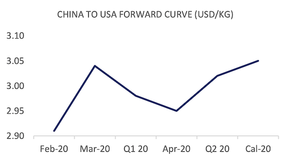 Front month forward curve prices reflect the near term confusion between trade lanes, China to Europe gaining 5 cents and trailing with an extra 4 cents gain on March 2020. China to USA loses 7 cents on the front month, whilst gaining 4 cents in March 2020 on the back of rate confidence.