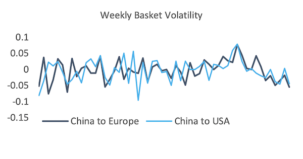 Basket lanes from China to Europe and China to USA soften volatility slightly, however the spreads widen substantially across airport to region pairings, Hong Kong vs Shanghai to Europe into negative territory once again (-0.18) and the Hong Kong vs Shanghai to USA spread widening to a recent record (0.68).