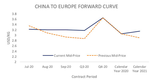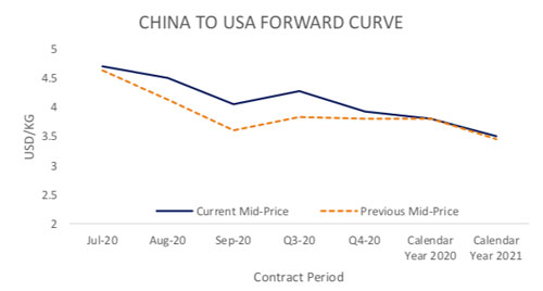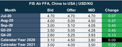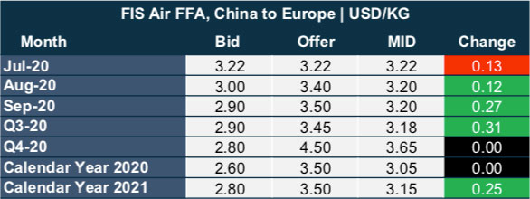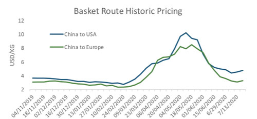 China to Europe and China to USA continue to climb in line with over-riding market sentiment indicative of a rebound in volume, with September forw ard pricing mid-value climbing 27 and 45 cents respectively along the two routes. China to Europe July 2020 MTD value settles 13 cents below its last week of trading, whilst China to USA July 2020 settles 7 cents higher, reflective of a more bullish trans-Pacific market. Europe – USA outbound continues to slowly slip, with Frankfurt to USA down 13 cents last week (although prices remain relatively high) . China to Europe Calender 2021 is priced 25 cents high on the back of an aggressive $3.50/kg offer for the full year.