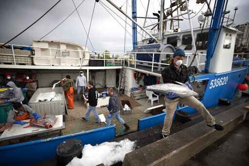 “This is a quarantine special,” a tanned Hawthorn donning a mask and blue surgical gloves joked as he took orders from people standing 6 feet (1.8 meters) apart on the dock while seals barked around his boat, the Kaylee H.