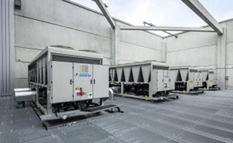The chillers share the roof-space with an 800kWp photovoltaic system.