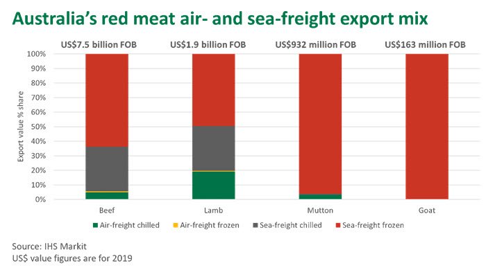Nationally, Australia still sends the bulk of red meat exports as sea freight – 94.4% of beef, 80.3% of lamb, 96.8% of mutton and 99.9% of goatmeat export value in 2019 – but air-freight is critical in servicing certain markets and customers, which have developed supply chains and marketing channels geared to quick-delivery chilled product. These business models are now facing significant challenges amidst a fast-evolving procurement landscape.