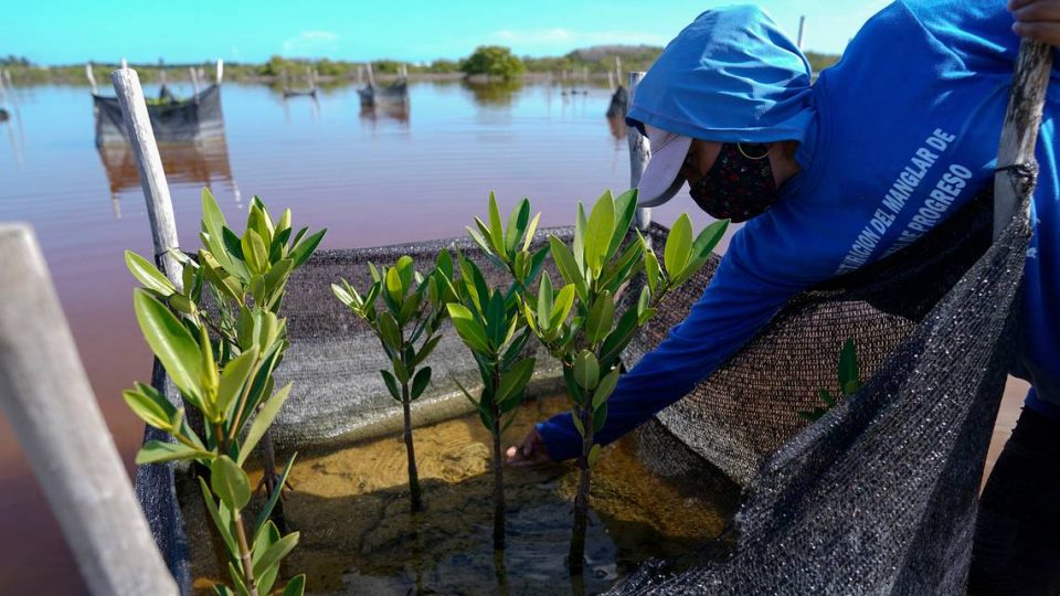 In addition to technologically advanced methods to remove carbon dioxide from the atmosphere, restoring natural habitats helps, too. A woman plants mangrove seedlings as part of a restoration project in Mexico’s Yucatan Peninsula.