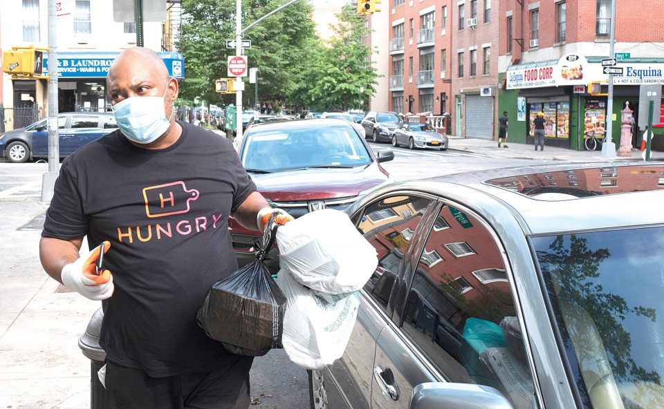 The Associated Press / Driver Frank Robinson delivers prepackaged meals in New York on Tuesday. Catering startup HUNGRY pays more than 200 drivers to deliver prepackaged meals to stay-at-home elderly people and low-income children.