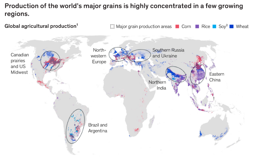 In a report published last month called, “Will the world’s breadbaskets become less reliable” authors Jonathan Woetzel, Dickon Pinner, Hamid Samandari, Hauke Engel, Mekala Krishnan, Nicolas Denis, and Tilman Melzer write, that the world’s growing population depends on four key crops – rice, wheat, corn, and soy – with a high geographic concentration of production.