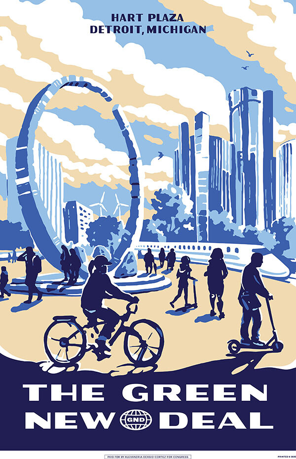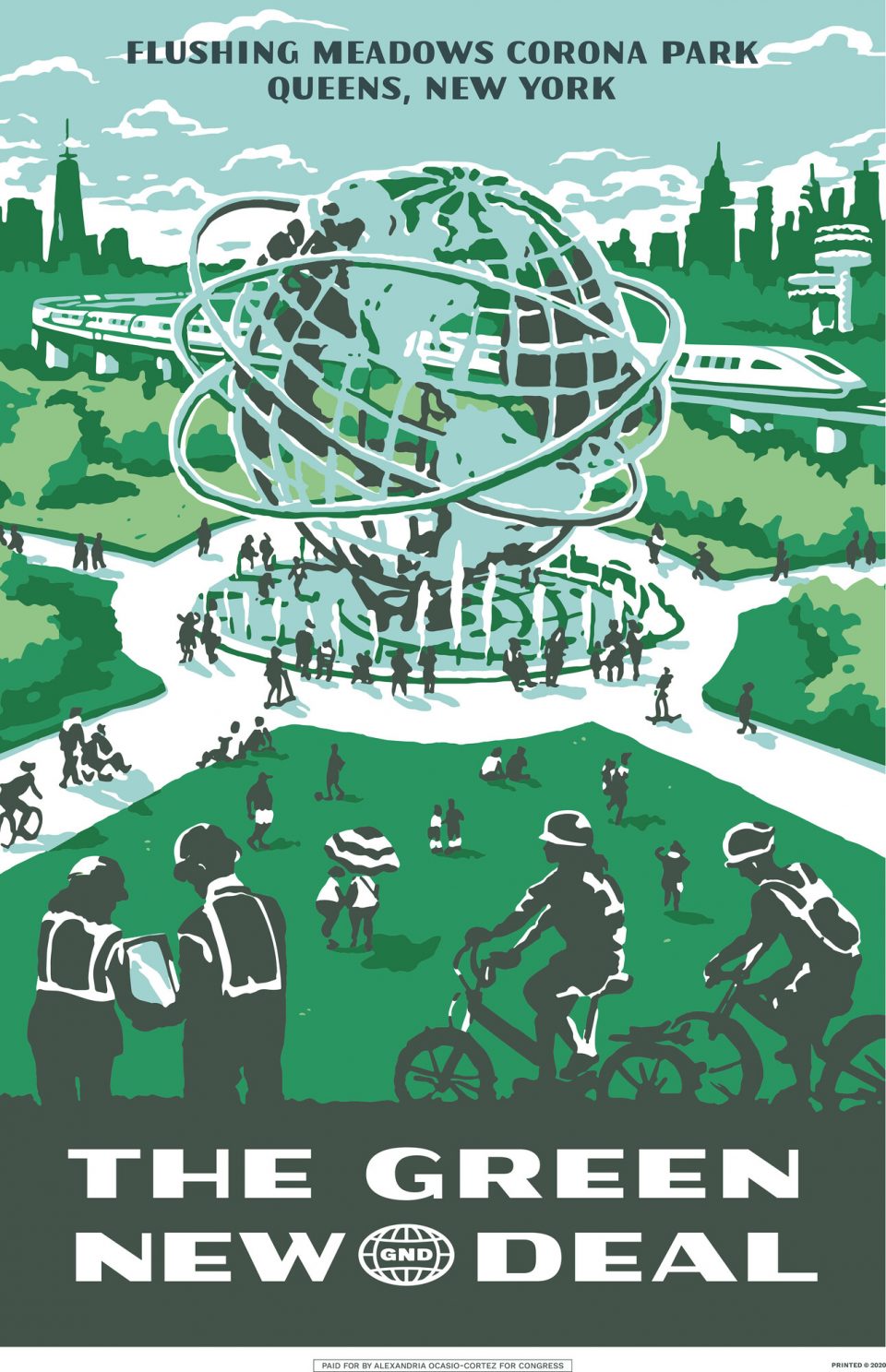 Green New Deal poster developed for Alexandria Ocasio Cortez’s campaign, 2020. Artist: Gavin Snider; Creative Director: Scott Starrett; Detailer Dayi Tofu, Maria Arenas; Type: Jamie Wilson. Copyright: Tandem, NYC.