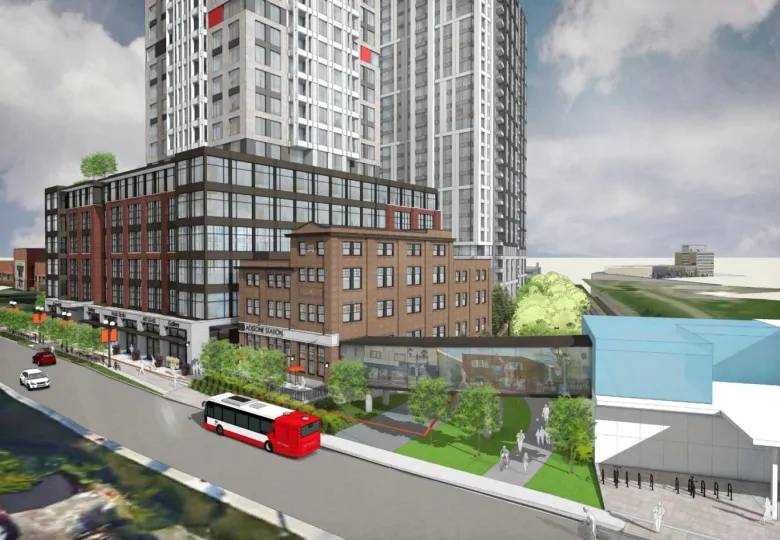 In its 2018 application, Trinity proposed restoring the building and incorporating it in the new development. An artist’s rendering of the proposal shows a glass walkway connecting the building to the future Gladstone LRT station.