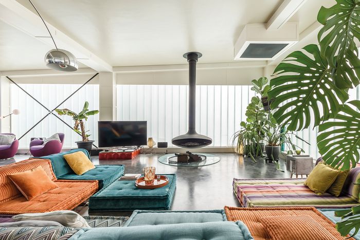 The top floor holds a 1,300-square-foot loft-style great room with a living area, a dining area, a suspended fireplace and folding glass doors that open to the 30-foot-long roof garden.