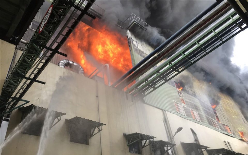 A fire broke out at 11:52 a.m. in the rubber processing department of Cheng Hsin’s factory in Changhua’s Xizhou Township, and four workers injured were sent to hospitals to be treated for smoke inhalation, the company said.