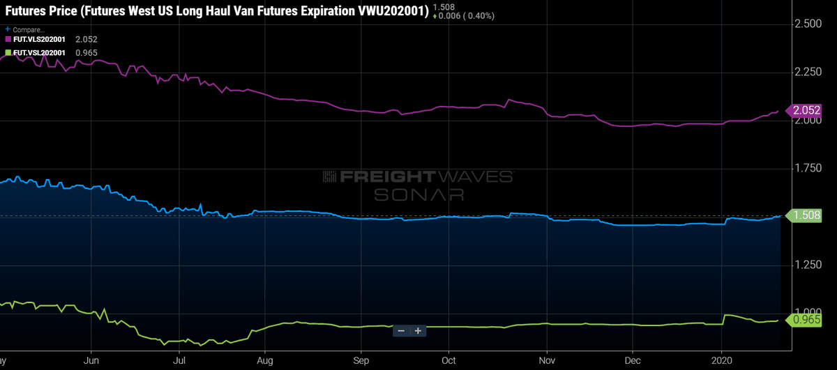 On the individual lanes, gainers outnumbered decliners by a margin of four to two, with one contract unchanged. In the East, it was a mixed bag as the PHL to CHI contract (FUT.VPC202001) gained a fraction to $1.086, the ATL to PHL contract (FUT.VAP202001) slipped 0.4% to $1.729 and the CHI to ATL contract (FUT.VCA202001) finished unchanged at $2.027. The LAX to DAL contract (FUT.VLD202001) in the South gained 0.6% on the day to $1.441; however, a 0.8% drop in the DAL to LAX contract (FUT.VDL202001) to $1.006 dragged the region lower. Comfortably in the driver’s seat is the LAX to SEA contract (FUT.VLS202001) from the West which rose nearly $0.01 on the day to $2.052. This follows a $0.043 or 2.15% rise from last week. The SEA to LAX contract (FUT.VSL202001), which has been beaten down since the beginning of the year, has gotten up off the floor and risen for a third consecutive session to $0.965, up 0.5% on the day.