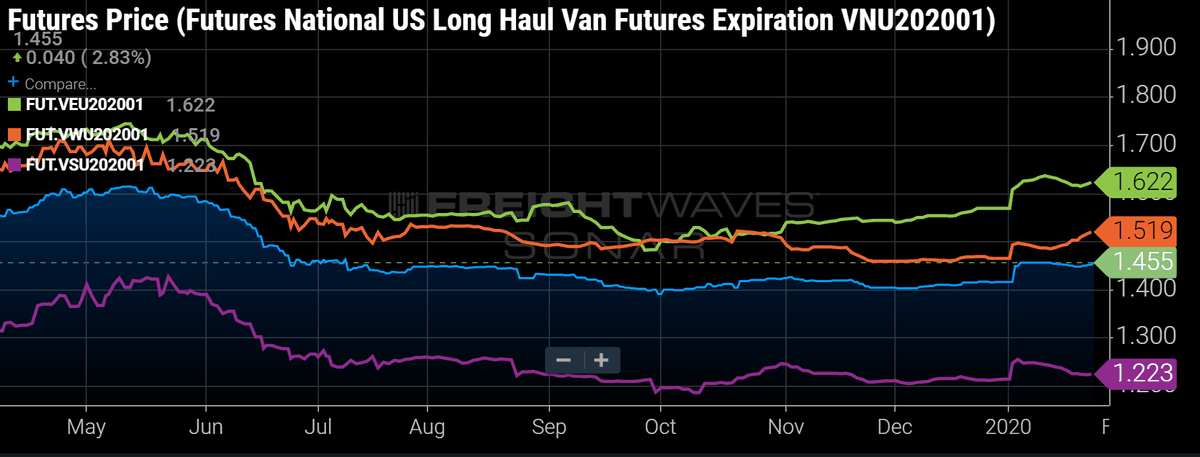 After a mild correction last week, the lanes in the East continued to firm as the CHI to ATL contract (FUT.VCA202001) rose 0.4% to $2.040, the ATL to PHL contract (FUT.VAP202001) gained 0.3% to close at $1.736 and the PHL to CHI contract (FUT.VPC202001) was unchanged at $1.089. In the West, both the LAX to SEA (FUT.VLS202001) and the SEA to LAX (FUT.VSL202001) contract continued moving higher by 0.4% and 0.2% to $2.070 and $0.968, respectively. The LAX to DAL contract (FUT.VLD202001) in the South added 0.4% and settled at $1.449, while the DAL to LAX contract (FUT.VDL202001) slipped 0.2% and “broke the buck” to $0.998.