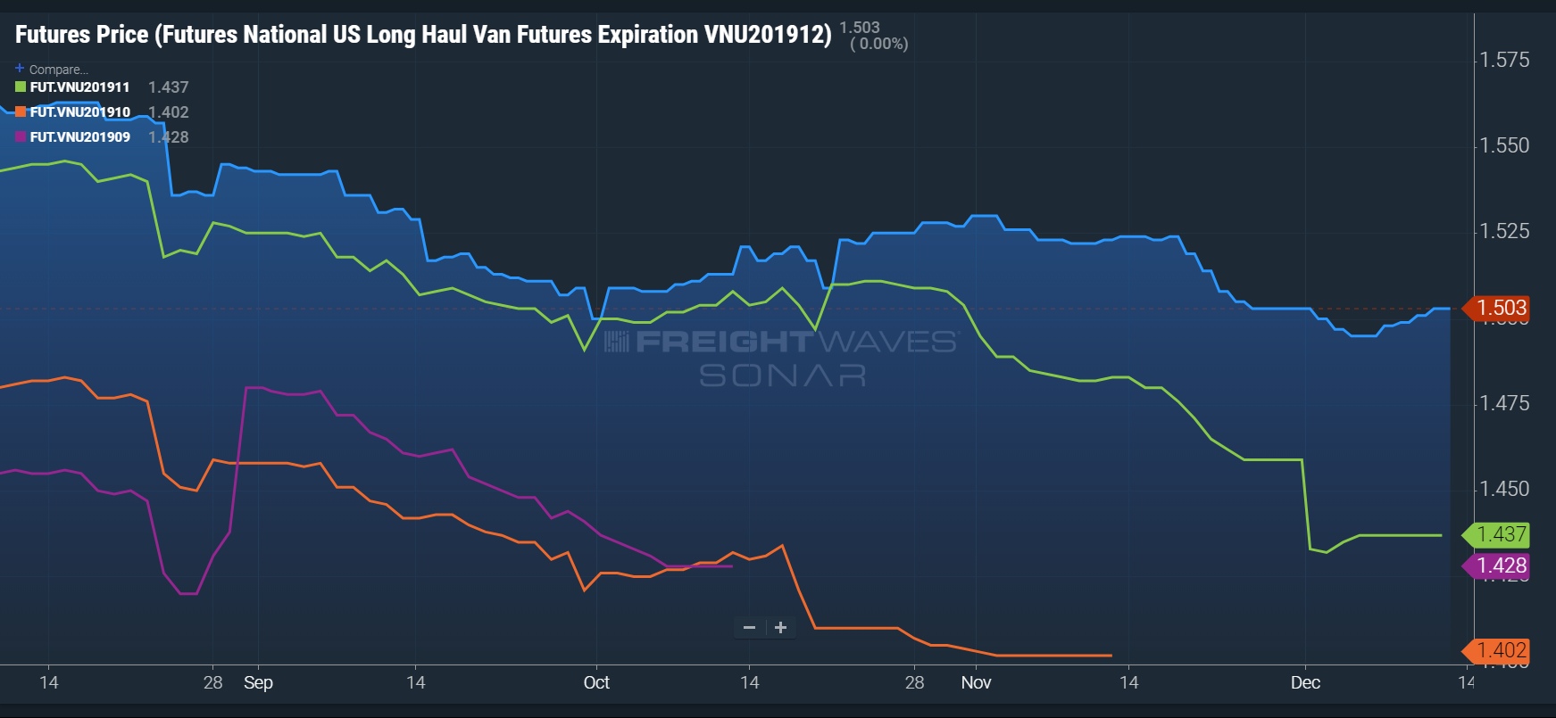 It was a relatively quiet day in the Trucking Freight Futures markets with three of the four averages finishing the day as they began. The spot National contract (FUT.VNU201912) was unchanged at $1.503/mile, still above the resistance point of $1.50 and the final settlements of the 3 previous spot months. The East regional (FUT.VEU201912) and West regional (FUT.VWU201912) contracts followed suit and settled at $1.541 and $1.649, respectively. The South regional contract (FUT.VSU201912) eked out a 0.15% gain to $1.321.