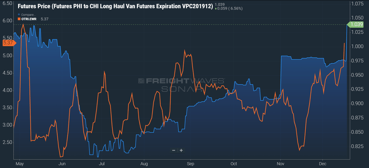 The “jail break” in the East happened on the PHL to CHI (VPC) lane and was orchestrated by further conjecture of shifting trade flow patterns from the West Coast to the East Coast. The December PHL to CHI contract (FUT.VPC201912) shot up $0.064 or 6.6% to a near life-of- contract high of $1.039. The entire VPC lane futures forward curve (FWD.VPC) also shifted upward approximately $0.035 per month across the board. In addition, outbound tender rejections around Newark, NJ (OTRI.EWR) have risen dramatically in the past 10 days to 5.37%. The CHI to ATL (FUT.VCA201912) and ATL to PHI (FUT.VAP201912) contracts failed to get caught up in VPC’s exhaust and remained unchanged at $1.946 and $1.701, respectively. The individual lanes in both the West and South regions delivered offsetting results. The LAX to SEA contract (FUT.VLS201912) in the West rose 0.2% to $2.055 while SEA to LAX (FUT.VSL201912) fell 0.24% to $1.243. In the South, the LAX to DAL contract (FUT.VLD201912) gained 0.31% as DAL to LAX (FUT.VDL201912) slipped 0.4% to close at $1.012.
