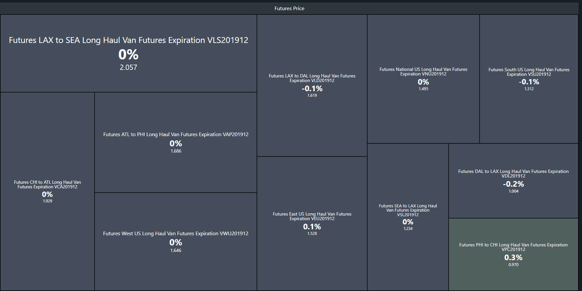 Two of the three lanes in the East were unchanged. The CHI to ATL (FUT.VCA201912) and the ATL to PHI (FUT.VAP201912) contracts were both flat on the day and settled at $1.929 and $1.686, respectively. The PHI to CHI contract (FUT.VPC201912) rose 0.3% to close at $0.970. In the West, both lanes were unchanged with the LAX to SEA contract (FUT.VLS201912) and SEA to LAX contract (FUT.VSL201912) ending at $2.057 and $1.234, respectively. In the South, the LAX to DAL contract closed down a fraction to $1.619 as did the DAL to LAX contract (FUT.VDL201912), which settled at $1.004.