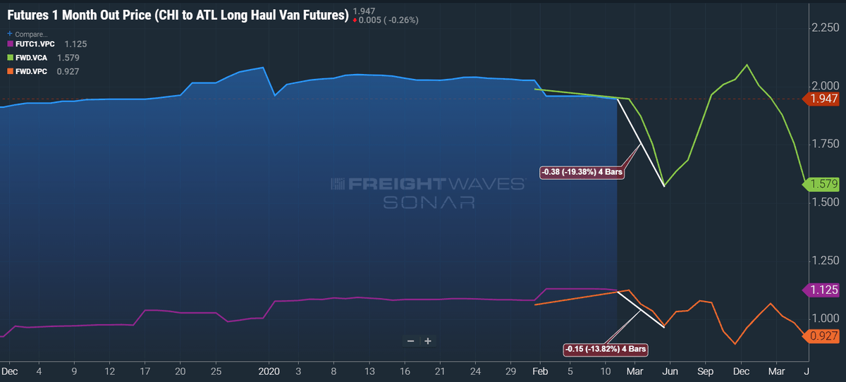 It was almost a repeat of Monday for the individual lane contracts. In the East, both Chicago contracts finished lower with the outbound CHI to ATL contract (FUT.VCA202002, FUTC1.VCA) dropping almost 0.3% to $1.947 and the inbound PHL to CHI contract (FUT.VPC202002, FUTC1.VPC) losing 0.44% on the day to $1.125. Looking at the respective forward curves (FWD.VCA, FWD.VPC) for today, the market is anticipating a depressed rate environment into June of nearly 20% out of Chicago and almost 14% on inbound Chicago rates, before there is any turnaround. Similar to Monday, the ATL to PHL contract (FUT.VAP202002) rose another 0.24% to finish at $1.665. In the South, both lane contracts finished lower. The LAX to DAL contract (FUT.VLD202002) slipped a fraction to $1.326 while the DAL to LAX contract (FUT.VDL202002) slid 0.4% to $1.072. It was a mixed bag in the West with a fractional rise in the SEA to LAX contract (FUT.VSL202002) to $0.933 being offset by a similar drop in the LAX to SEA contract (FUT.VLS202002) to $1.978.