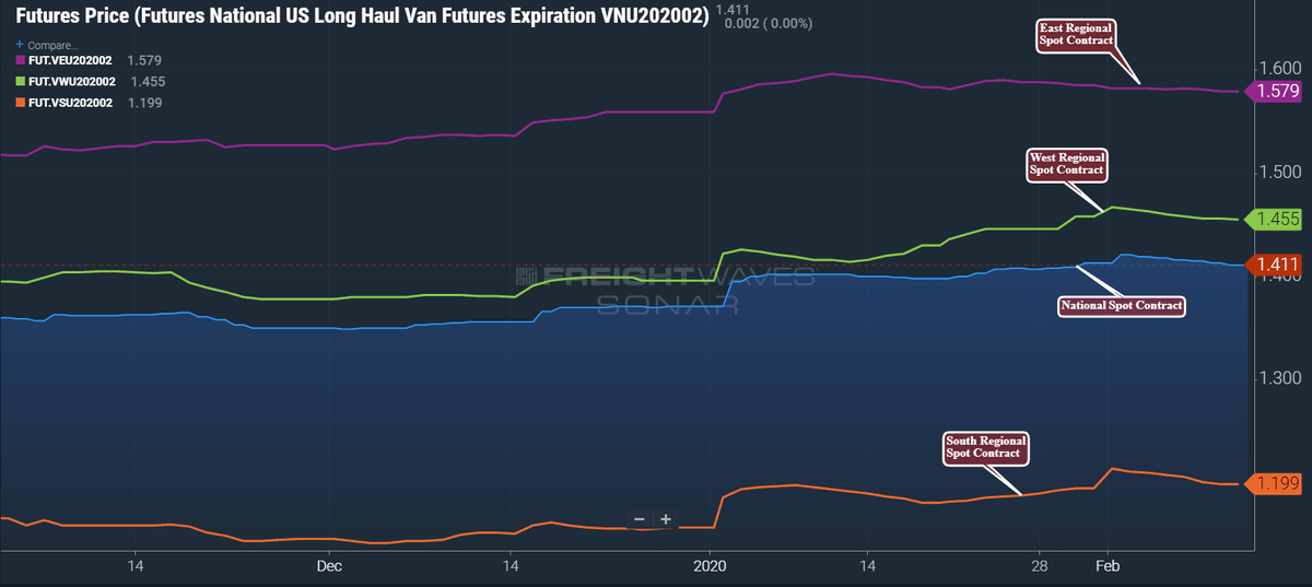 It was a very quiet day for Trucking Freight Futures with little news or fundamental changes to stoke the market on Wednesday. The spot National contract (FUT.VNU202002) ended the day unchanged at $1.411/mile. Also finishing unchanged for the session were the East regional (FUT.VEU202002) and South regional (FUT.VSU202002) contracts, which closed at $1.579 and $1.199, respectively. The West regional contract (FUT.VWU202002) closed lower by a fraction to $1.455. Since the beginning of the month, spot month rates have been stuck in a flat to slightly lower rut.
