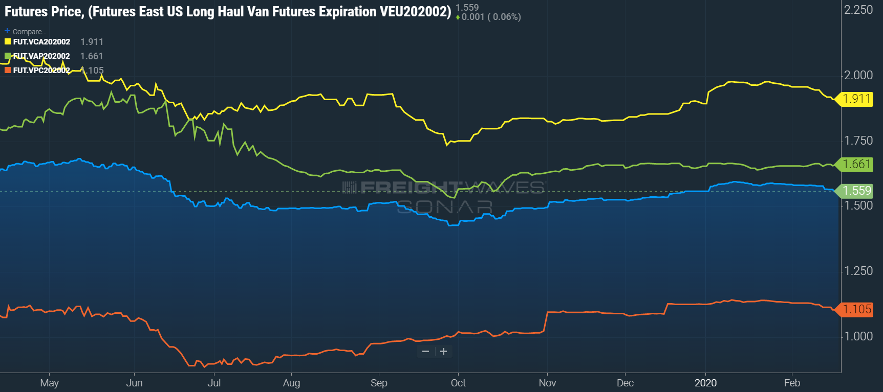 Pushing the East region up a fraction was the ATL to PHL contract (FUT.VAP202002) which rose by 0.2% to end the day at $1.661. The CHI to ATL contract (FUT.VCA202002) stood pat at $1.911 as did the PHL to CHI contract (FUT.VPC202002), which closed at $1.105. In the West, the SEA to LAX contract (FUT.VSL202002) fell by a fraction to $0.917 and the LAX to SEA contract (FUT.VLS202002) held steady at $1.950. The story was the same in the South with the LAX to DAL contract (FUT.VLD202002) fractionally off to $1.316 while the DAL to LAX contract (FUT.VDL202002) ended the day where it began, at $1.060.