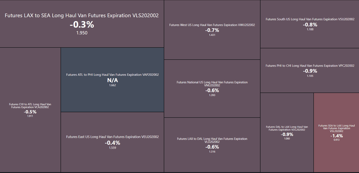 Six of the seven individual lane contracts finished lower w/w with only the ATL to PHL contract (FUT.VAP202002) in the East ending unchanged at $1.662. The CHI to ATL contract (FUT.VCA202002) slid 0.5% w/w to close at $1.911. The PHL to CHI contract (FUT.VPC202002) was down $0.01 (0.9%) for the week and ended at $1.105. Two other big downward movers were the lane contracts into the LAX market. In the West, the SEA to LAX contract (FUT.VSL202002) stumbled to $0.913, down $0.013 (1.4%) w/w, as the LAX to SEA contract (FUT.VLS202002) lost 0.3% to $1.950. In the South, the DAL to LAX contract (FUT.VDL202002) shed $0.01, or almost 1%, to settle at $1.060.  The LAX to DAL contract (FUT.VLD202002) slipped by 0.25% on Friday and ended its week off by 0.6% to $1.316.