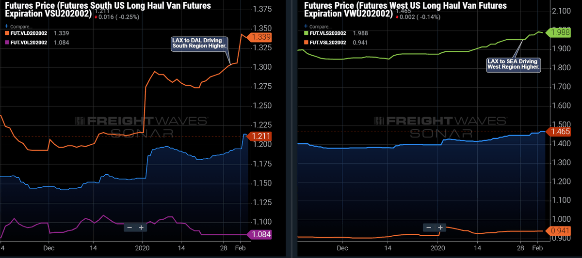 The seven individual lane contracts ended the day with five contracts unchanged and two slightly lower. Three of the unchanged contracts were in the East with the CHI to ATL contract (FUT.VCA202002) ending at $1.959, the ATL to PHL contract (FUT.VAP202002) staying at $1.656 and the PHL to CHI contract (FUT.VPC202002) holding firm at $1.131. The lane contracts in the South and the West were mixed, with the outbound LAX contract in each region reversing course, and settling lower on the day. In the South, the LAX to DAL contract (FUT.VLD202002) dropped 0.3% to close at $1.339 while the DAL to LAX contract (FUT.VDL202002) ended the day flat at $1.084. Shifting to the West, the LAX to SEA contract (FUT.VLS202002) closed down 0.25% to $1.988 and the SEA to LAX contract (FUT.VSL202001) remained steady at $0.941.