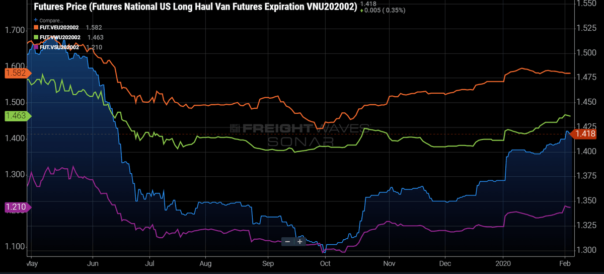 It was a repeat of Tuesday’s market in the East with all three lane contracts finishing unchanged. The CHI to ATL contract (FUT.VCA202002) settled at $1.959, the ATL to PHL contract (FUT.VAP202002) stayed put at $1.656 and the PHL to CHI contract (FUT.VPC202002) ended at $1.131. In the West, both contracts were fractionally lower. The LAX to SEA contract (FUT.VLS202002) slipped to $1.987 while the SEA to LAX contract (FUT.VSL202002) inched lower to $0.939. In the South, the LAX to DAL contract (FUT.VLD202002) shed 0.2% to close at $1.336, marking the second straight session where both outbound LAX contracts were lower. The DAL to LAX contract (FUT.VDL202002) was unchanged again at $1.084.