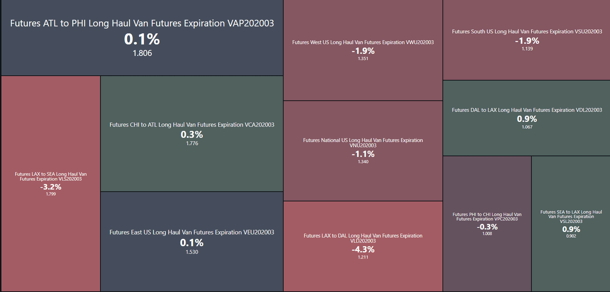 Trucking Freight Futures posted moderate gains across the board on Friday, March 13 to wrap up a tumultuous week as the global pandemic roiled the global equities and oil markets, as well as strained supply chains. For the week, the spot National contract (FUT.VNU202003) ended $0.015, or 1.1%, lower to $1.340/mile. While the East regional contract (FUT.VEU202003) closed fractionally higher w/w to $1.530, both the West regional (FUT.VWU202003) and South regional (FUT.VSU202003) contracts slid 1.9% to settle at $1.351 and $1.139, respectively. Both regions were dragged lower by more steep declines in the outbound LAX lanes.