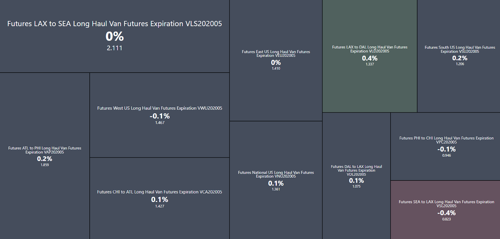 It was a calm start to the week for the Trucking Freight Futures markets as the spot National contract (FUT.VNU202005) rose a fraction to $1.361 per mile. The South regional contract (FUT.VSU202005) rose 0.25% to $1.206, while the West regional contract (FUT.VWU202005) fell a fraction to $1.467. The East regional contract (FUT.VEU202005) held steady at $1.410.