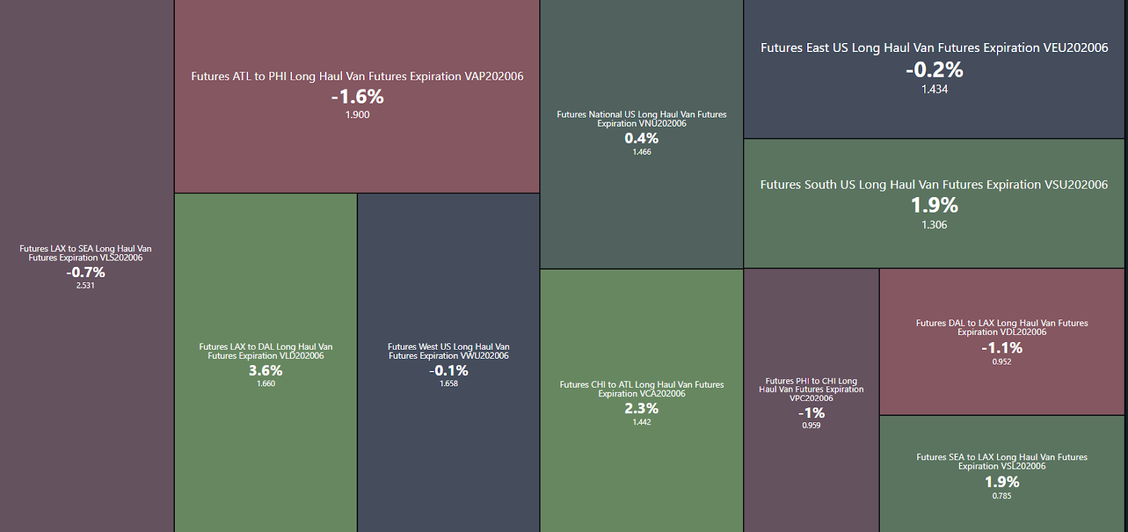 On the individual lanes, the LAX to DAL contract (FUT.VLD202006) in the South surged $0.058, or 3.6%, to $1.660 and was partially offset by a $0.011 (1.1%) decline in the DAL to LAX contract (FUT.VDL202006) to $0.952. In the East, the CHI to ATL contract (FUT.VCA202006) rose $0.032, or 2.3%, to $1.442, while the ATL to PHL contract (FUT.VAP202006) fell $0.031 (1.6%) and the PHL to CHI contract (FUT.VPC202006) slipped $0.01 (1%), to $1.900 and $0.959, respectively. In the West, a $0.015, or 2%, rise in the SEA to LAX contract (FUT.VSL202006) to $0.785 was wiped out by a $0.019 (0.75%) drop in the LAX to SEA contract (FUT.VLS202006) to $2.531.