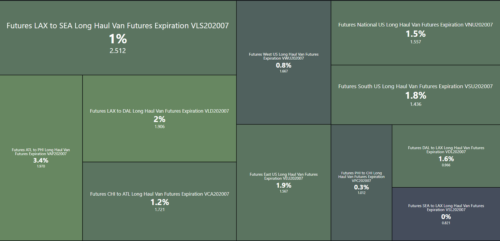 On the individual lanes, the ATL to PHL contract (FUT.VAP202007) jumped $0.065, or 3.4%, to $1.970; the CHI to ATL contract (FUT.VCA202007) rose $0.02 (1.2%) to $1.721; and the PHL to CHI contract (FUT.VPC202007) climbed 0.03% to settle the week at $1.012. In the West, the LAX to SEA contract (FUT.VLS202007) gained $0.026 (1.1%), to $2.512, and the SEA to LAX contract (FUT.VSL202007) finished unchanged at $0.821. In the South, the LAX to DAL (FUT.VLD202007) contract jumped another $0.038, or 2% for the week, to $1.906, and the DAL to LAX contract (FUT.VDL202007) strengthened by $0.015, or 1.6%, to $0.966.