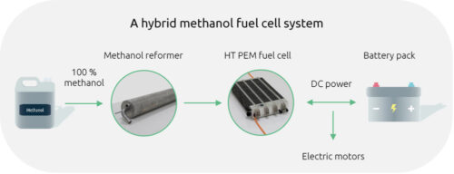 Fuel cells is a prominent technology for indirect electrification through renewably produced methanol to overcome the inherent disadvantages of batteries in heavy-duty applications. A methanol fuel cell drivetrain is equipped with an onboard reformer converting the liquid methanol into a hydrogen-rich gas. The fuel cell converts the reformate gas into electricity powering the electric motors. The combination of onboard reforming and high-temperature PEM fuel cells creates a thermal symbiosis offering high electrical efficiency while eliminating NOx, SOx and particle (PM) emissions. Methanol from biomass and renewable origin also eliminates CO2 emissions from a well-to-wheel perspective and truly enables CO2-neutral mobility.