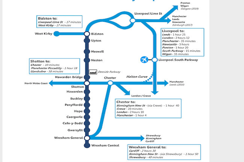 There is a long-standing desire to improve passenger services north from the Welsh town of Wrexham, making better connections with the peninsula of land between North Wales and Liverpool – commonly known as The Wirral – and the principal town of Birkenhead, at the north end. Birkenhead is an Industrial town, somewhat rivalling its neighbour across the River Mersey, Liverpool. It may have been the first settlement in the world to boast a formal public park, but its industrial heritage still generates traffic for the rail sector. Elsewhere, the presence of Shotton steelworks on the line is a significant customer for rail freight operations.