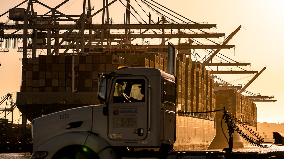 In this Tuesday, Oct. 19, 2021, photo a truck arrives to pick up a shipping containers, drives by vessels moored at the Maersk APM Terminals Pacific, Pier 400, Port of Los Angeles. (AP Photo/Damian Dovarganes) (AP Newsroom)