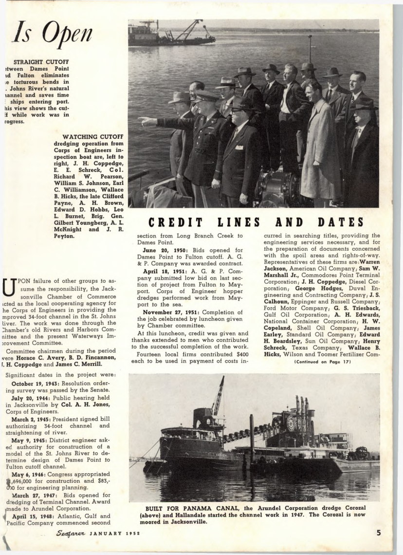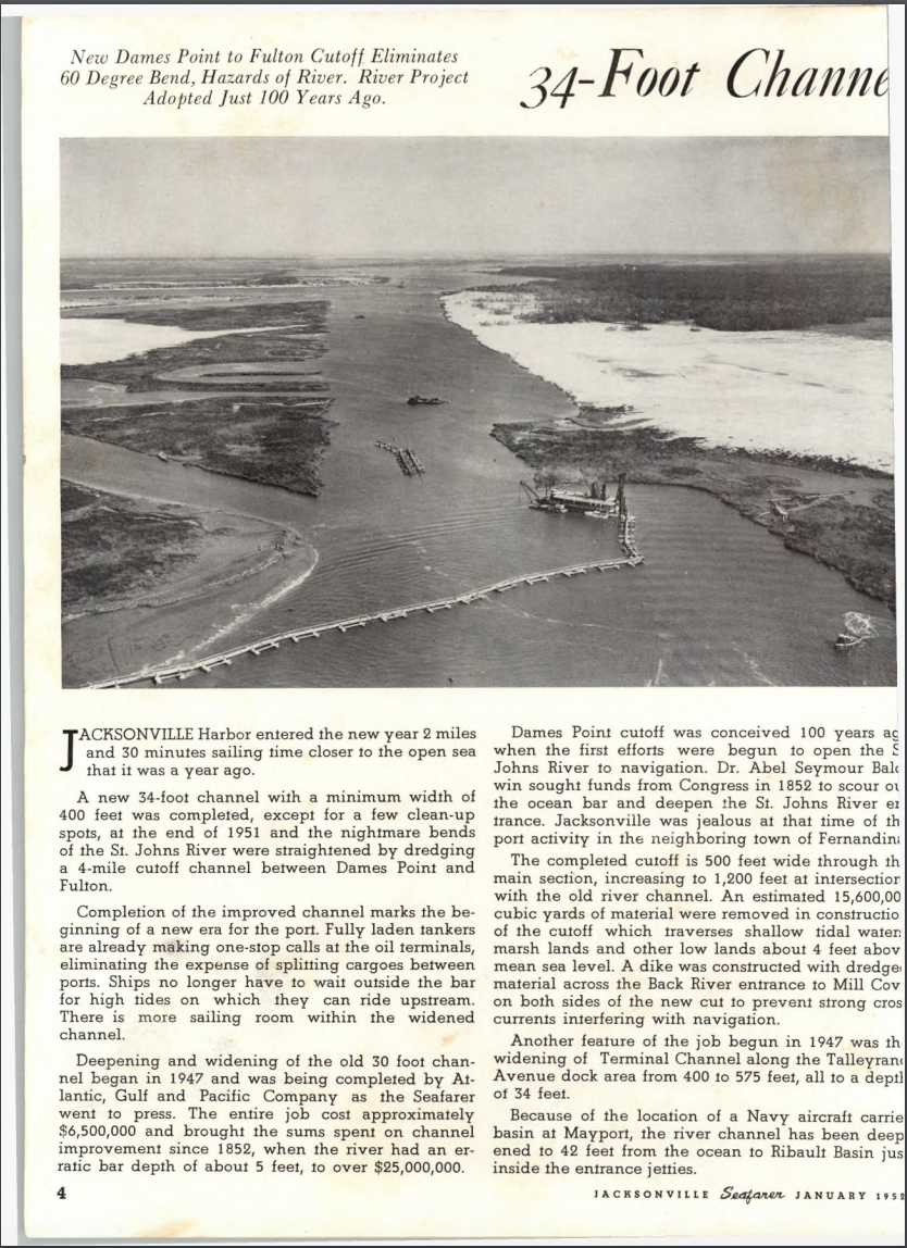 Travel time, however, was not the only reason Jacksonville proceeded with the maritime project worth $6.5 million [approximately $63 million in 2020]. Those who’ve navigated the St. Johns River for decades have noted the hazardous bends of the river as causes of concern. The 34-foot-deep, 400-foot-minimum-width channel replaces an older, smaller channel creating a navigable four-mile straight cutoff between Dames Point and Fulton. An estimated 15.6 million cubic yards of marshlands and other low lands about 4 feet above sea level were removed in constructing the channel.